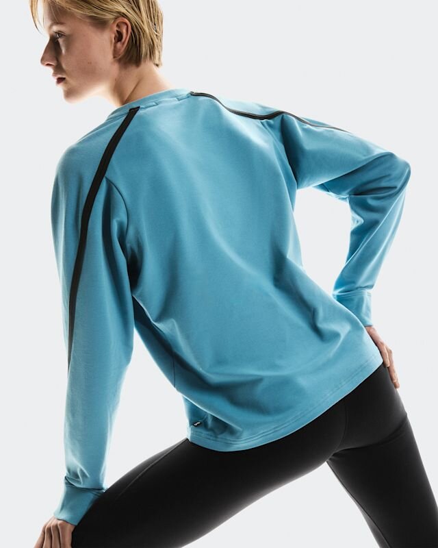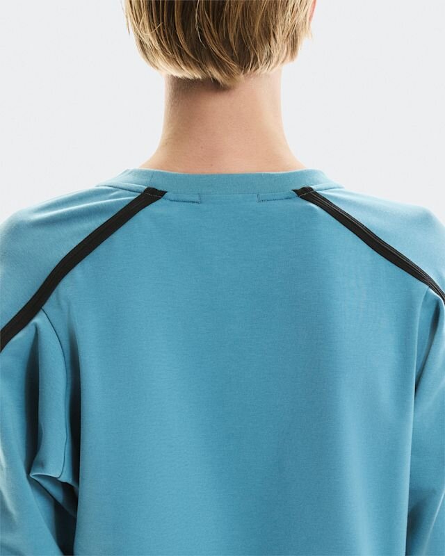 Ribbing on the neckline and wrist cuffs give this crew a premium feel. Breathable mesh slits run along the arm, creating a subtle yet unique design detail. And a considered neck tape hanger loop for easy storage.